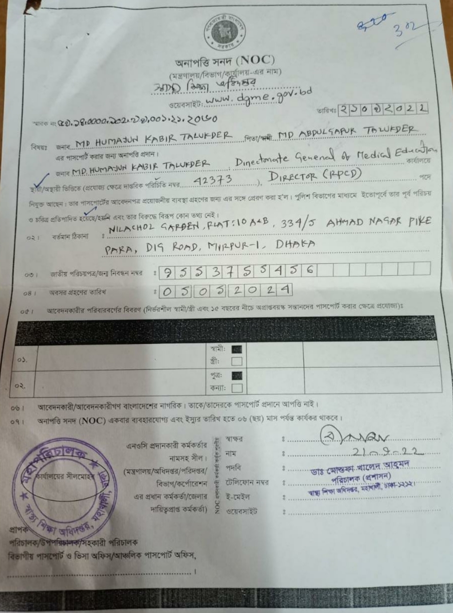 মো: ফরহাদ হোসেন, অধ্যক্ষ, কক্সবাজার মেডিকেল কলেজ এর অনাপত্তি পত্র (NOC)